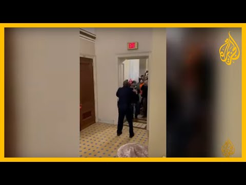 تداول ناشطون على مواقع التواصل مشاهد فيديو تظهر مطاردة مؤيدي ترمب لشرطي أسود بعد اقتحامهم مبنى الكونغرس. وتظهر الصور الشرطي وهو يتراجع خوفا على حياته ويشير عصا في وجههم فيما يلاحقه أنصار ترمب.