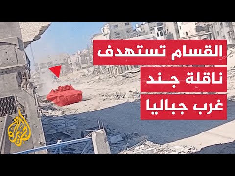 نشر الاعلام العسكري التابع لكتائب القسام مشاهد استهداف ناقلة جند إسرائيلية بقذيفة الياسين 105 قرب مفترق الصفطاوي غرب معسكر جباليا شمال القطاع.