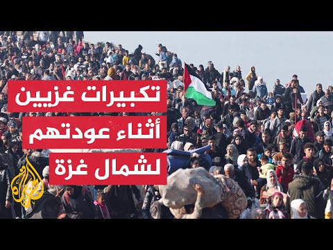 فلسطينيون يكبرون أثناء عودتهم إلى شمال قطاع غزة