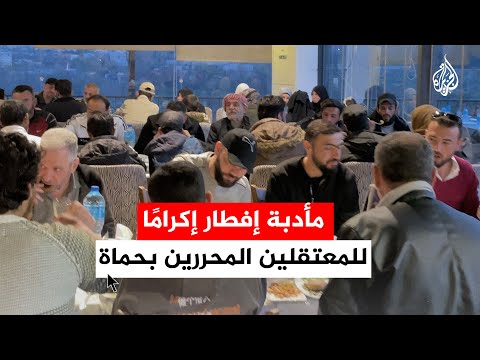 تداول ناشطون، مشاهد مصورة، تظهر إقامة مأدبة إفطار إكرامًا للمعتقلين المحررين في حماة. وتظهر اللقطات تجمع المعتقلين السابقين لدى النظام المخلوع في سوريا، وهم يتحدثون عما جرى لهم.