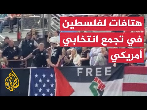 هتافات مناصرة لفلسطين وصافرات استهجان في قاعة تجمع انتخابي بولاية أيداهو، عقب إزالة عناصر الأمن الأمريكي علم فلسطين وتوقيف من رفعوه.