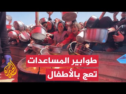 تجمع نازحون فلسطينيون في مخيم بخان يونس، جنوب قطاع غزة، لاستلام وجبات الطعام التي يقدمها "مطبخ رفح الخيري"، في ظل معاناة المنطقة من نقص حاد في الإمدادات الغذائية. يظهر في اللقطات المصورة حشد من الأهالي، أغلبهم من الأطفال، ينتظرون مع حاوياتهم بينما يقوم موظفو المطبخ الخيري بإعداد وتقديم الوجبات.
