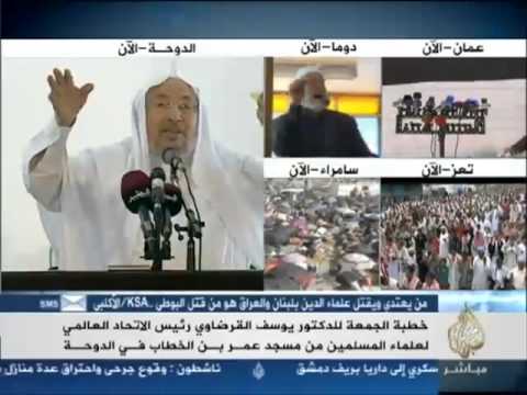 الشيخ يوسف القرضاوي خلال صلاة الجمعة 22-3-2013 يعلّق على مقتل صديقه الشيخ محمد سعيد رمضان البوطي مفندا بالتناقضات بين علمه وموقفه الموالي للنظام السوري القاتل ومؤكدا على اغتيالات سابقة قام بها النظام بحق عدة شخصيات في سوريا بنفس الاسلوب.