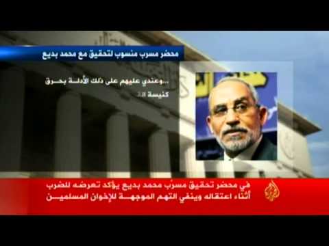 كشف محضرٌ مسربٌ منسوبٌ إلى تحقيقات النيابة العامة مع مرشد جماعة الإخوان المسلمين محمد بديع، عن تعرّضه للضرب أثناء اعتقاله، وحسبما جاء في المحضر فقد رفض بديع كل التهم الموجهة إلى جماعة الإخوان