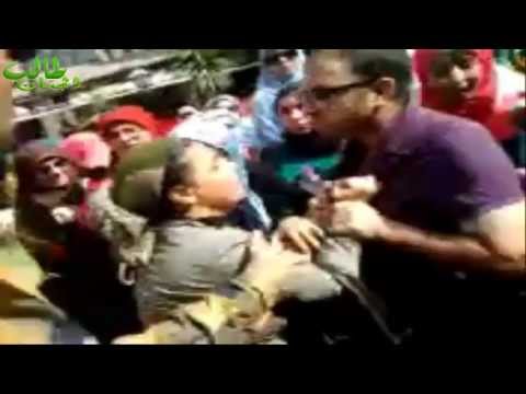 موظفة بجامعة المنصورة مؤيدة للانقلاب تعتدي على احد الطلاب اثناء المظاهرة بهمجية.