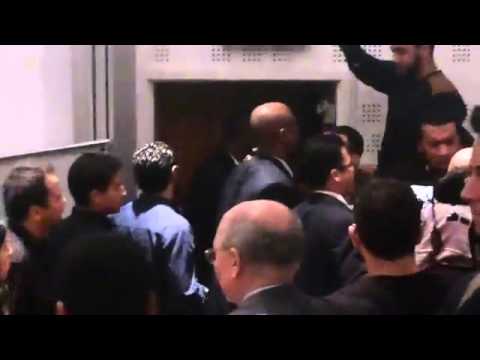 بعد طرد علاء الاسوانى الجالية المصرية تطرد ممثل تمرد من القاعة فى لندن ويهتفون رابعه ويسقط يسقط حكم العسكر.
