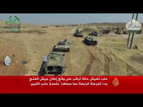 أعلن جيش الفتح بدء مرحلة جديدة للسيطرة على كامل مدينة حلب، كما تعرضت أحياء وبلداتها لقصف جوي مكثف. وقتلت المعارضة المسلحة العشرات من جنود النظام في تفجير نفق بحي الإذاعة، كما حاولت قوات النظام اقتحام مخيم حندرات.