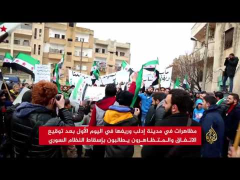 خرجت عدة مظاهرات في مدينة إدلب وريفها في اليوم الأول لسريان الهدنة المبرمة بين النظام والمعارضة، وطالب المتظاهرون بإسقاط النظام السوري وتوحد فصائل المعارضة.